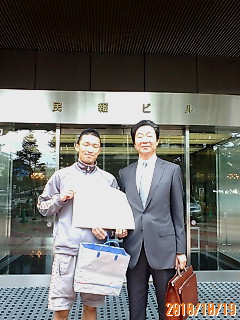 下の写真は、民報社前での角田会長とまっしーです(=^▽^=)